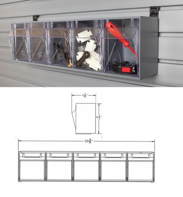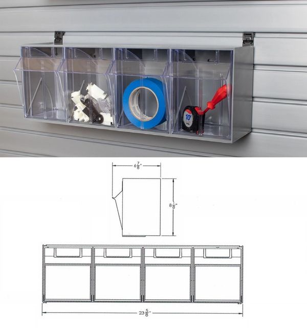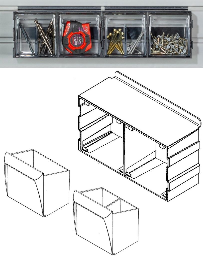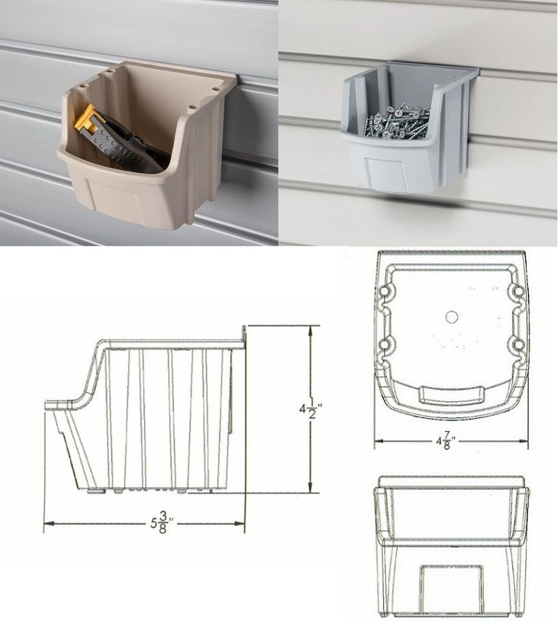 Each two bin unit is made to attach to the slatwall without the need for separate hooks.